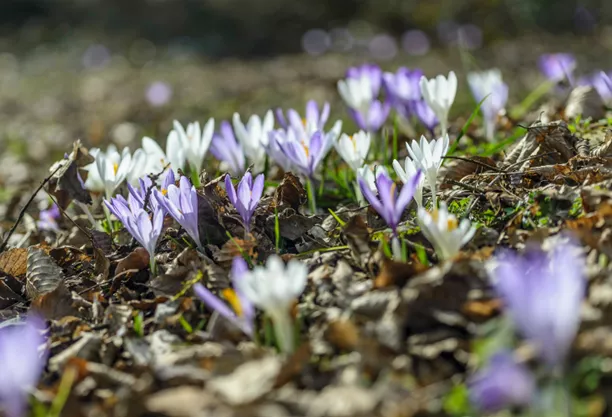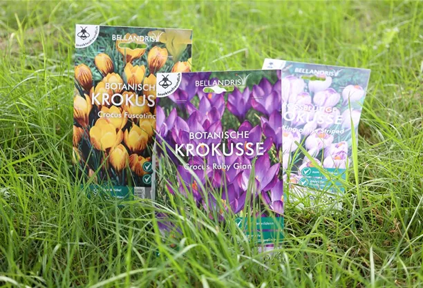 - Crocus chrysanthus (Gold-Krokus), Crocus tommasinianus (Elfen-Krokus), Crocus chrysanthus (Kleiner Krokus) und Crocus vernus (Frühlings-Krokus)- Farben: violett, gelb und weiß, aber auch mehrfarbige Sorten