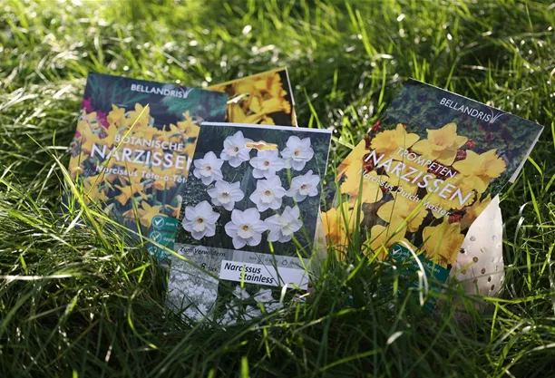 - Narcissus cyclamineus ‘Tete a Tete’ (Apenveilchen-Zwergnarzisse), Narcissus ‘Carlton’ (Großkronige Narzisse), Narcissus ‘Yazz’, Narcissus ‘Red Devon’, Narcissus 'Standard Value' (Gelbe Trompetennarzisse)- Farben: weiß, gelb, orange