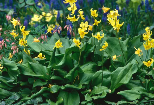 - Erythronium Hybride ‘Pagoda’ (Gartenhundszahn)- Farben: die oben genannte Sorte hellgelb, es gibt jedoch auch Arten in weiß und rosa, diese sind jedoch anspruchsvoller und schwerer zu verwildern