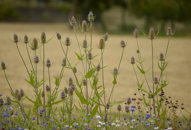 Die Himmelsleiter (oder auch Jakobsleiter) – Polemonium caeruleum – findet sich häufig auf Wiesen und an Wegrändern. Diese heimische Wildstaude ist nicht nur eine wertvolle Bienenweide, sondern eignet sich auch als Schnittblume. Im Garten macht sich die Jakobleiter gut in naturnahen Rabatten. Im Juni und Juli bezaubert sie mit ihren Blüten und erreicht eine Höhe von 55 Zentimetern. Jakobsleitern lieben wie die meisten unserer heimischen Wildstauden die Sonne.7. Wilde Karde – Dipsacus fullonum