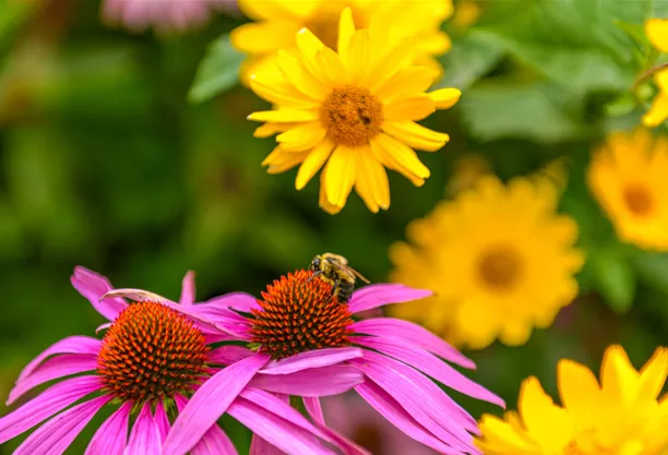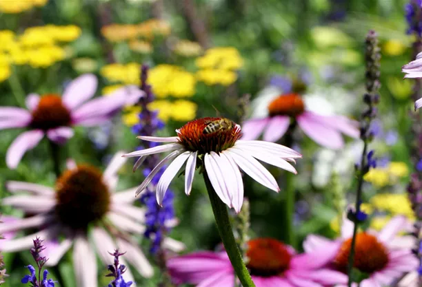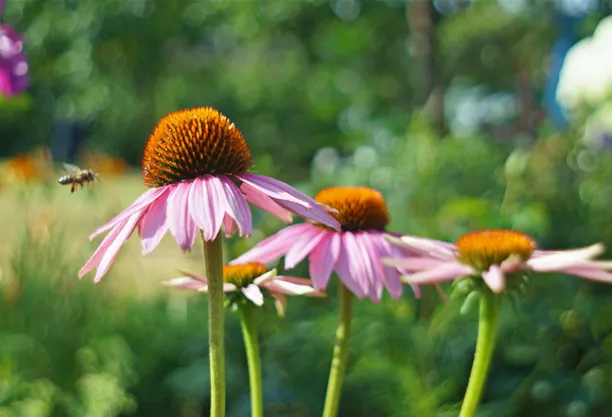 Echinacea ist eine schöne, winterharte Gartenstaude, die zur Zeit sehr gefragt ist. Das liegt sicher an ihren extravaganten, farbenfrohen Blüten. Besonders in Präriegärten wird sie gerne mit filigranen Gräsern kombiniert und hat sich als robust und trockenheitsverträglich erwiesen.Umso schöner, dass sie auch ökologisch wertvoll ist: Mit einem Nektar- und Pollenwert von 2 ist sie absolut bienenfreundlich. Nicht nur Honigbienen, sondern auch Hummeln, Schwebfliegen und Schmetterlinge fühlen sich von ihr magisch angezogen.