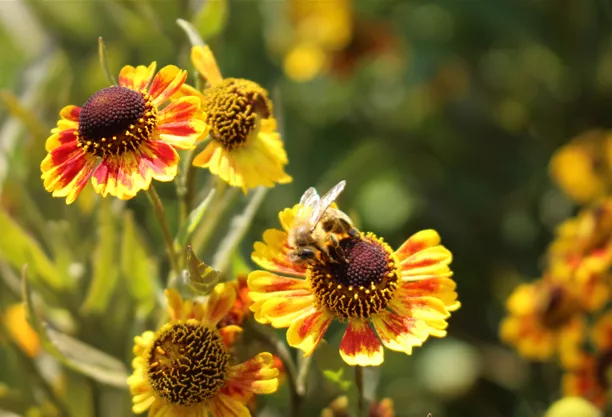 Mit einem Pollenwert von 4 und einem Nektarwert von 3 gehört die Gewöhnliche Sonnenbraut mit ihren guten Trachtwerten eindeutig zu den mehrjährigen Bienenweiden. Sie ist dabei vor allem für Honigbienen, Schwebfliegen und Hummeln interessant.Im Garten bezaubert die Gewöhnliche Sonnenbraut mit ihren leuchtend gelben, orangefarbenen und roten Blüten. Sie passt stilistisch in einen üppig blühenden Bauerngarten, wie auch in moderne Staudenpflanzungen, die mit Gräsern kombiniert werden. Sie blüht von Juli bis September und liebt sonnige Standorte.