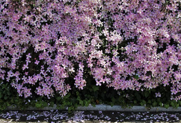 Auch Lösungen wie Gabionen erfreuen sich großer Beliebtheit und können auf Wunsch zusätzlich bepflanzt werden, um einen natürlicheren „Look“ zu erhalten, wie hier im Fotobeispiel. Diese Gabionen werden von einer blühenden Clematis berankt, so dass die Steinwand selbst gar nicht mehr zu sehen ist. Ein Schnitt ist bei Clematis nicht notwendig. Alternativ kann auch wilder Wein oder Efeu verwendet werden.
