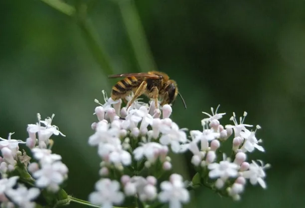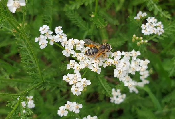 Blütenvorliebe: Spezialisiert auf Korbblütler, ab Juli besonders auf Rainfarn. Sie mag Schafgarbe z. B. Gold-Schafgarbe und Wiesen-Schafgarbe, Kamille z. B. Echte Kamille, Hundskamille, Färber-Kamille und Römische Kamille, Margeriten, Alant und Mutterkraut.