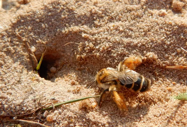 Nistplatz: Bevorzugt vegetationsarme, sandige und geneigte Bodenstellen und nistet in der Erde.
