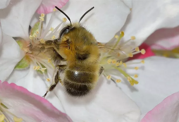 Wissenswertes: ist ein Kulturfolger und besonders effizient beim Bestäuben von Obstbäumen. Die gehörnte Mauerbiene lebt solitär, d. h. die Weibchen bauen ihr eigenes Nest und versorgen ihre Brut ohne Mithilfe von Artgenossen.
